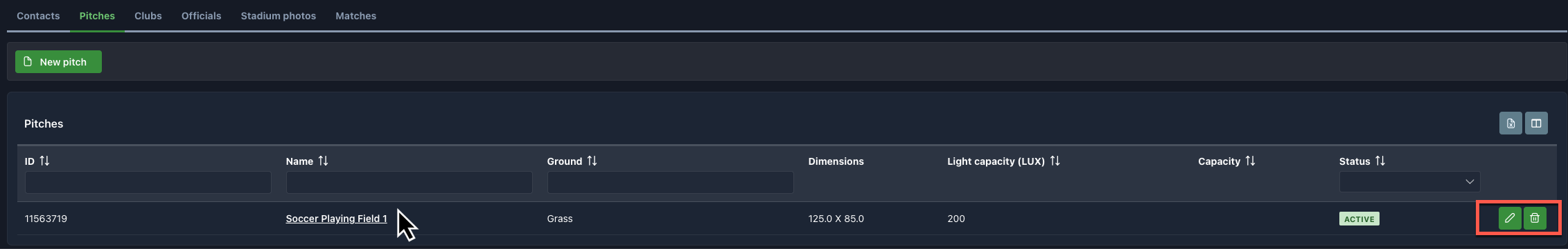 💡 The tabled list of pitches consists of the following information: Pitch ID, Status (Active/Inactive), Name, Light Capacity, Dimensions, Ground, Category, and Capacity Box.