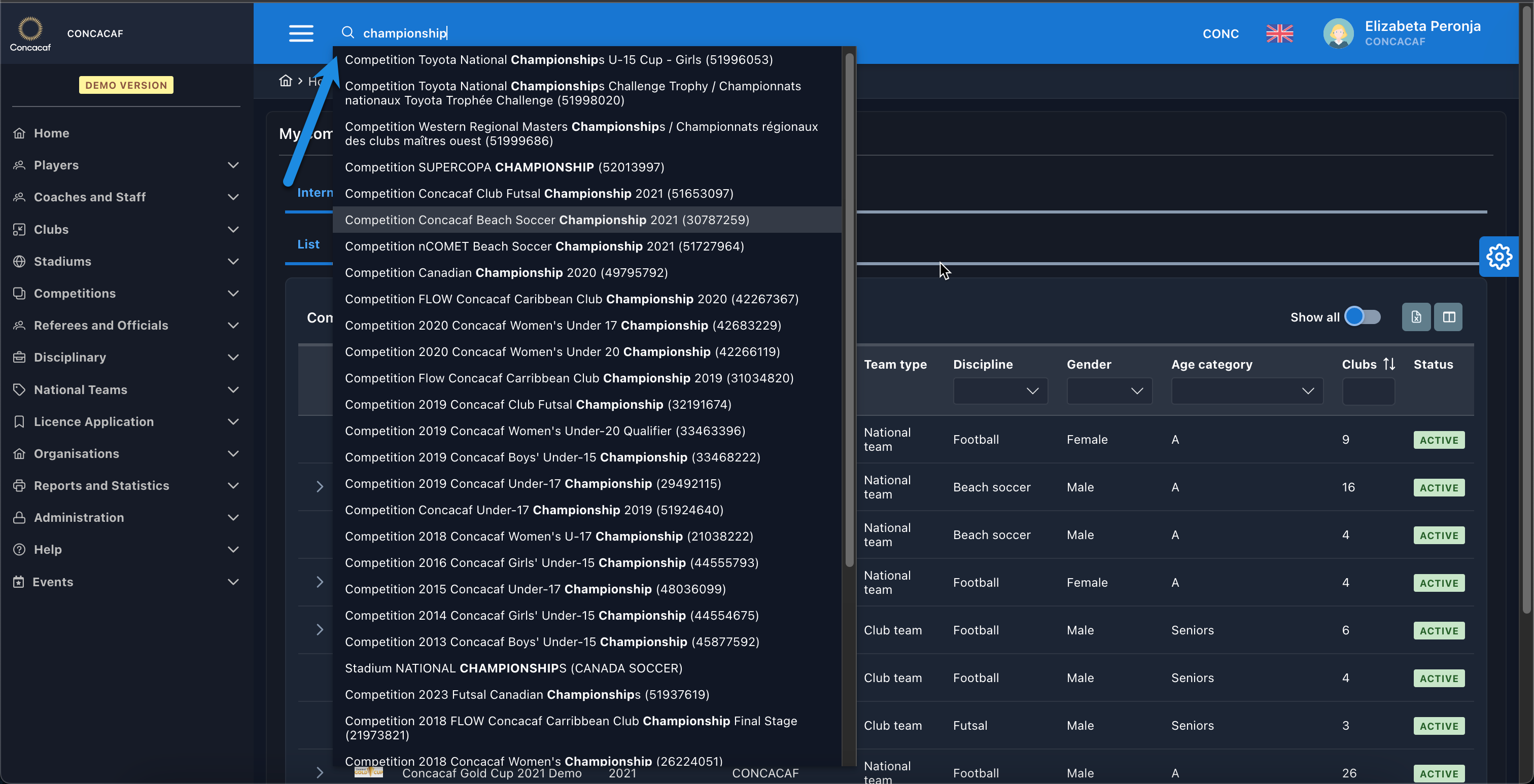 Start typing the input of the COMET Entity in the search box (e.g., first, and last name of a person, name of a club, match ID, FIFA ID, competition name, stadium, associations, etc.)