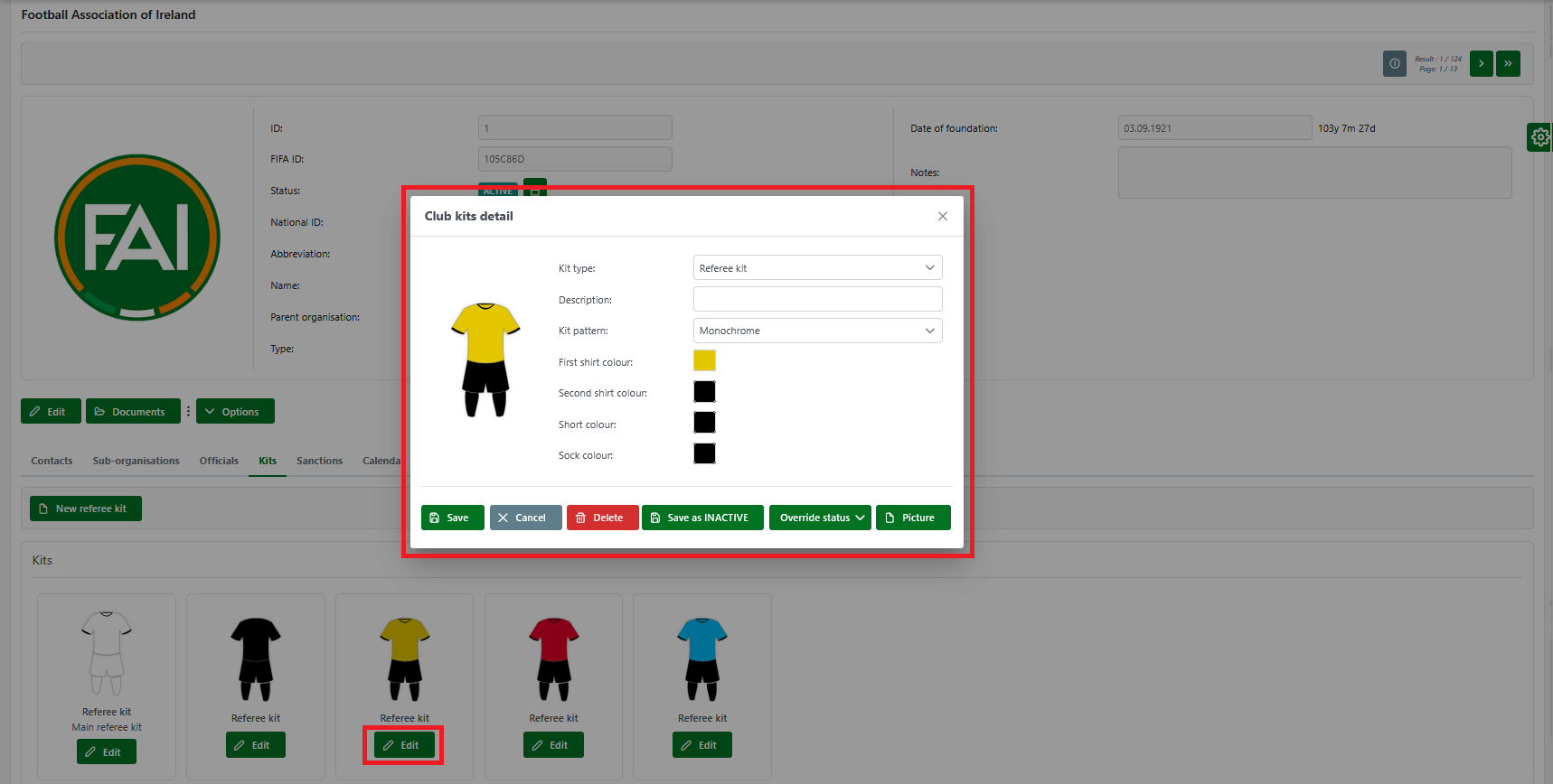 From here you can edit the design of your kit, set the kit as active/inactive, delete kit or upload the image of the referee kit.