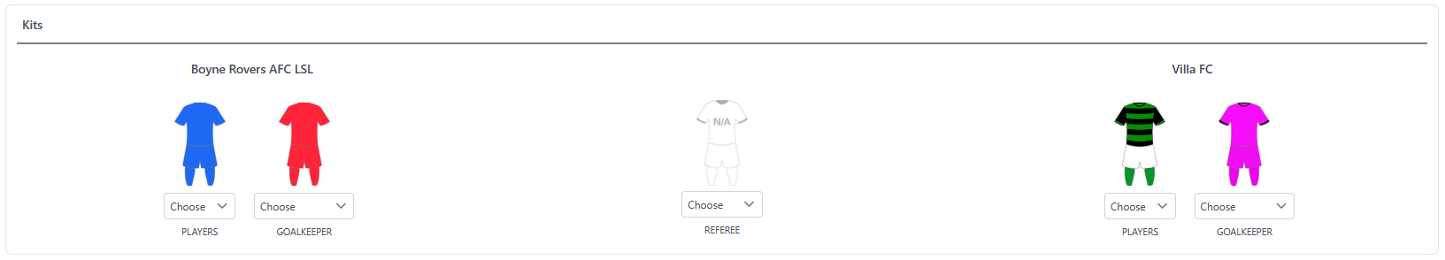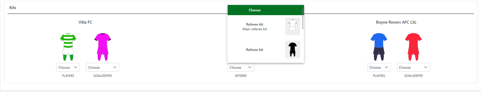 To add a kit to a match, go to the main page of a specific Match, and then scroll down to the Kits section of the match. From here you are able to select a kit for clubs and for referees, as shown in the images below.