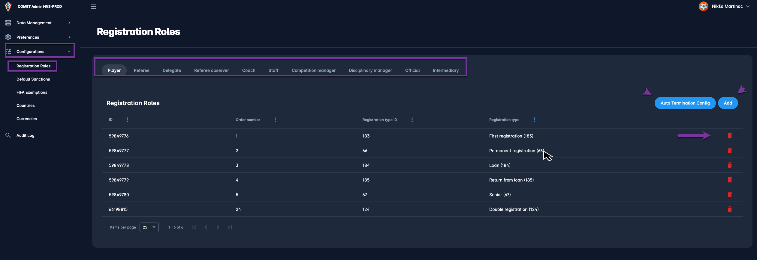 Each tab contains the list of Registration Roles and allows you to view and edit the registration types available for your tenant and all of your users.