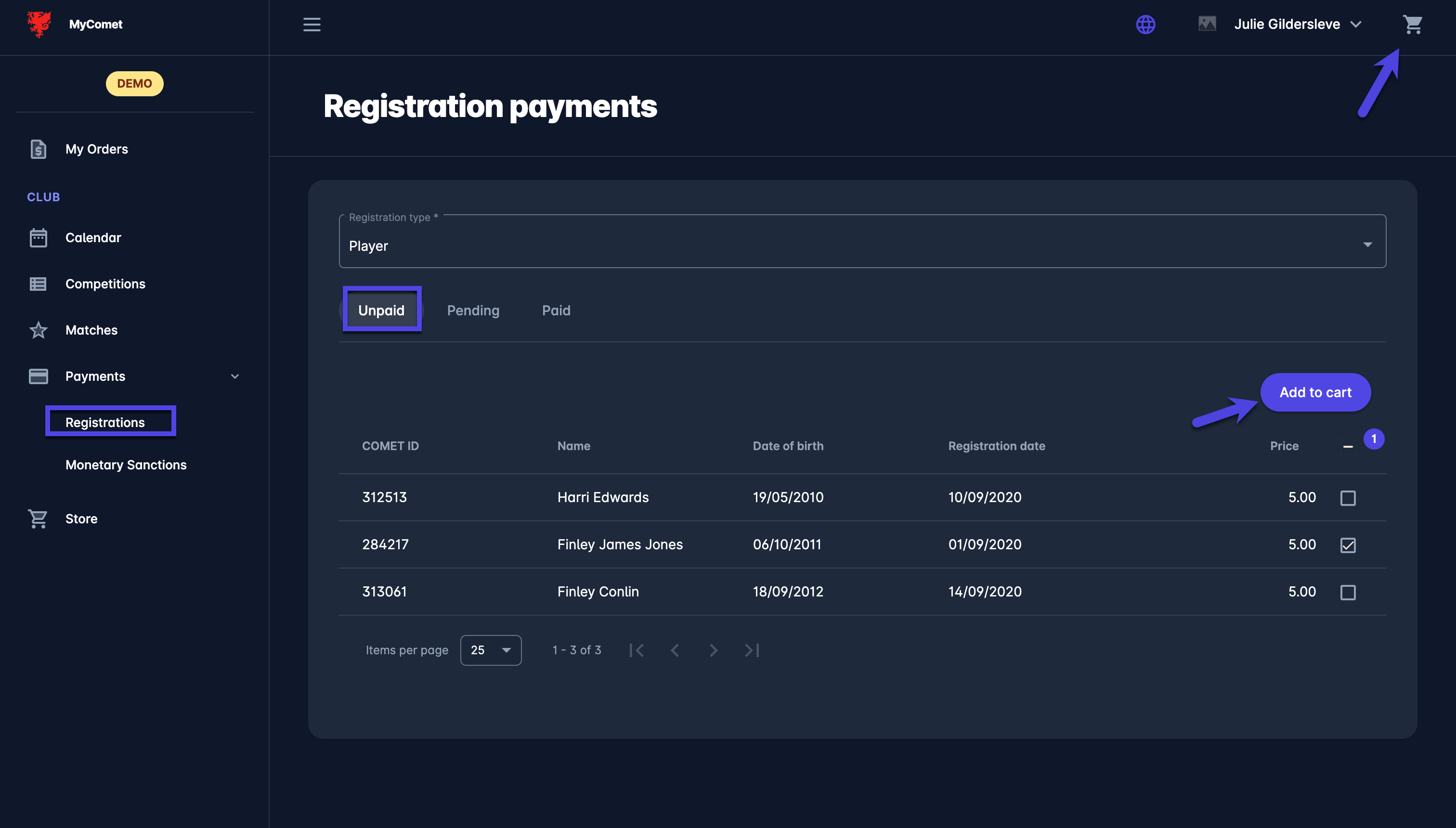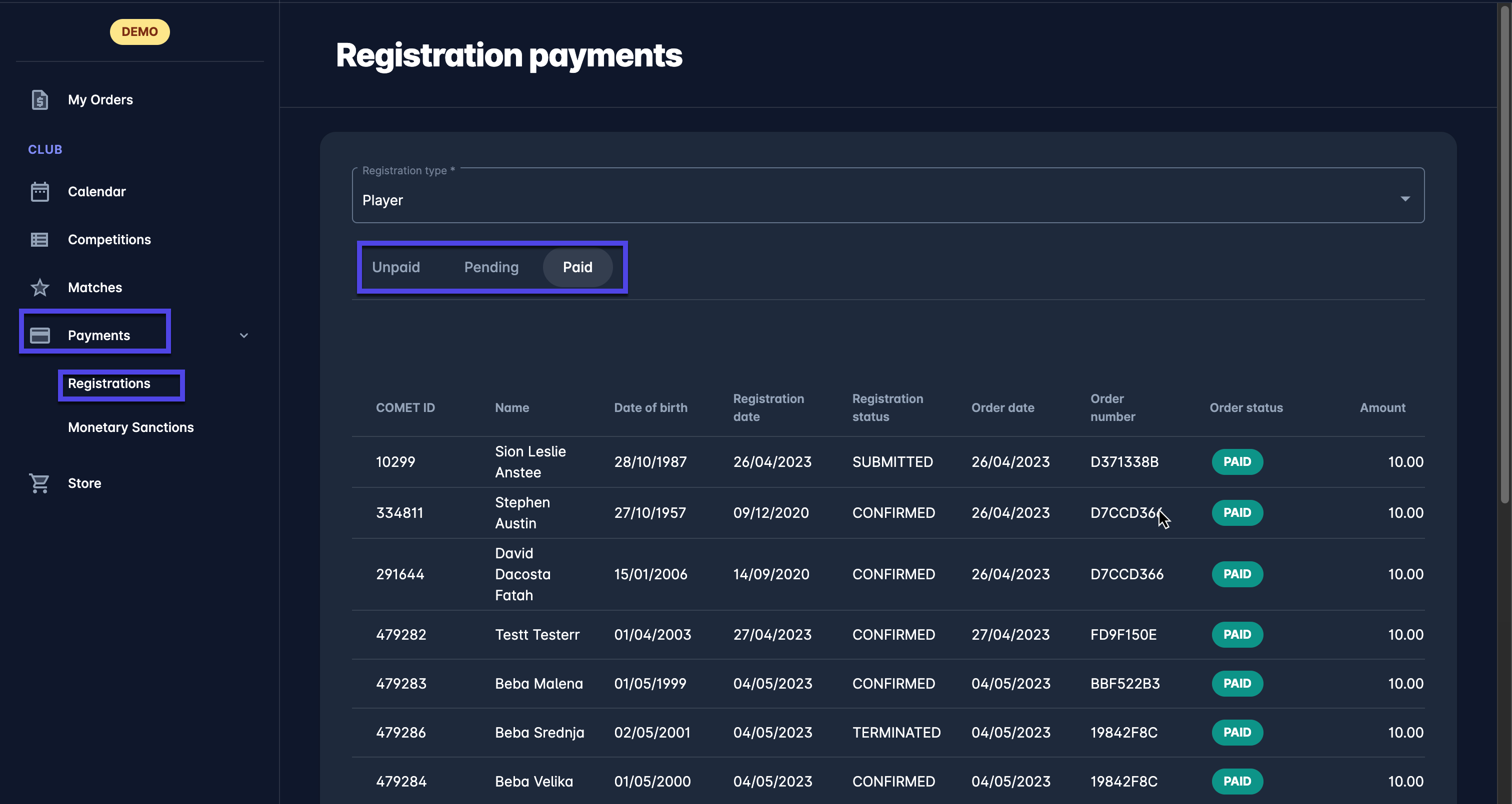 Once your payment is successfully conducted the player COMET registration will automatically be set to CONFIRMED and the registration will be listed in the Paid Tab