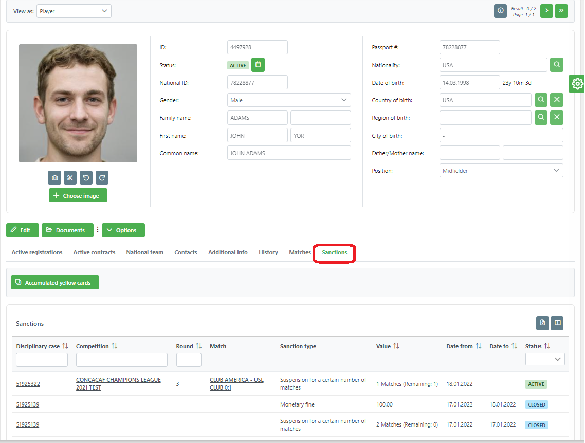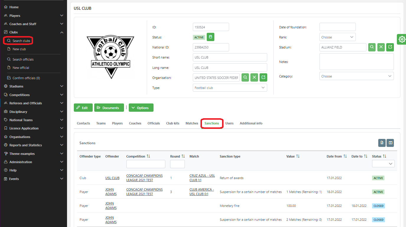 On a player form, and also on a club form there is the Sanctions tab on which you can open all the sanctions that were assigned to a player or to a club.