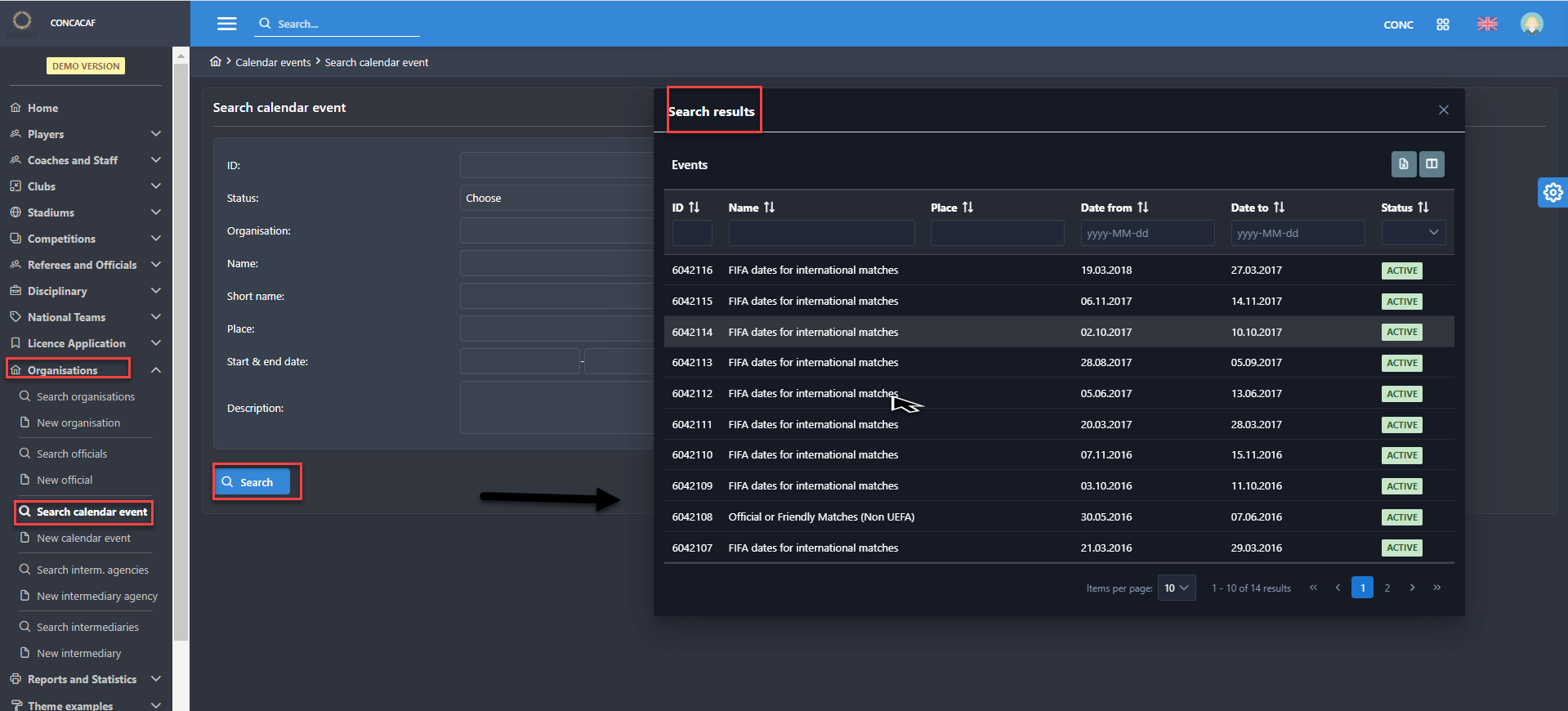 Click the Search calendar event menu item and enter any known search criteria