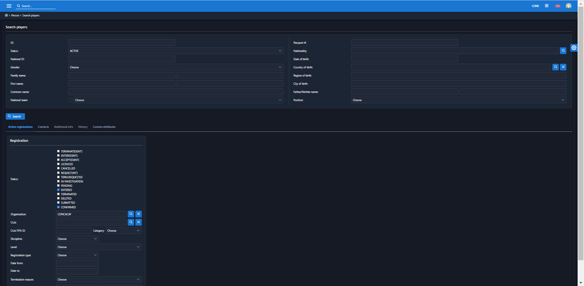 The menu item Search players will call up an empty search form, similar to the First registration form, to enter search criteria (see below).