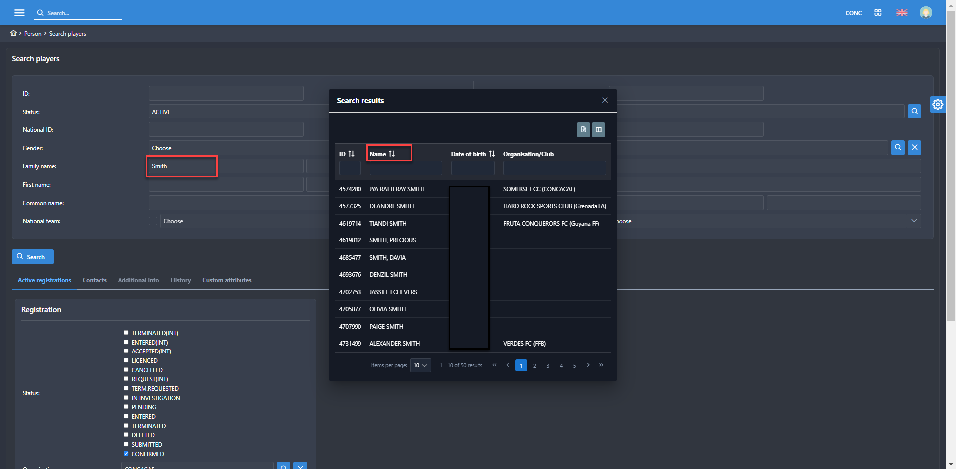 Note: The last column in the list shows the Club where the player is actively registered. If this field is empty, then the listed player does not have an active registration. That means that the player is available for registration.