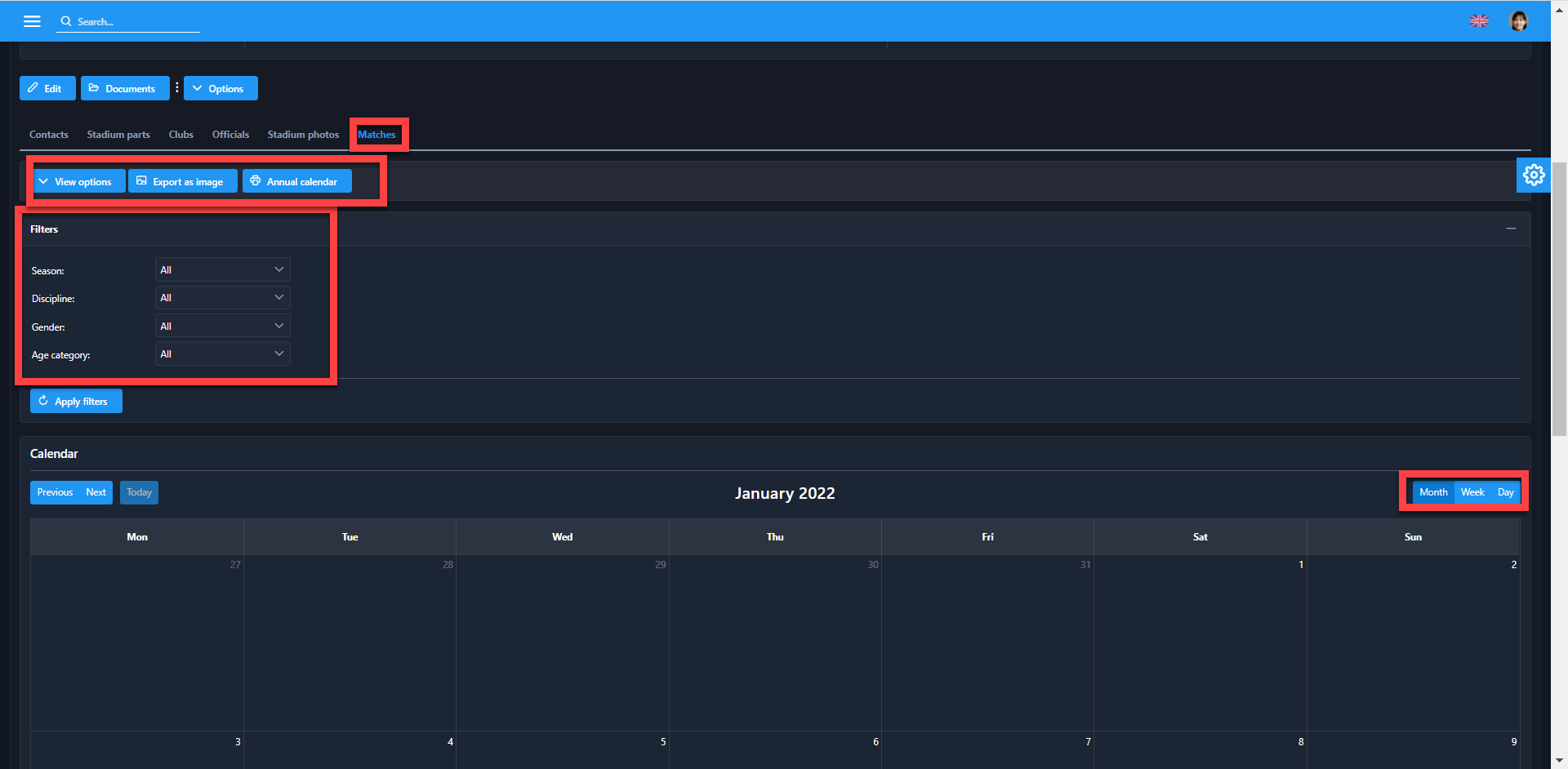 Filter: You can filter the results displayed on the calendar by Season, Discipline, Gender and Age Category