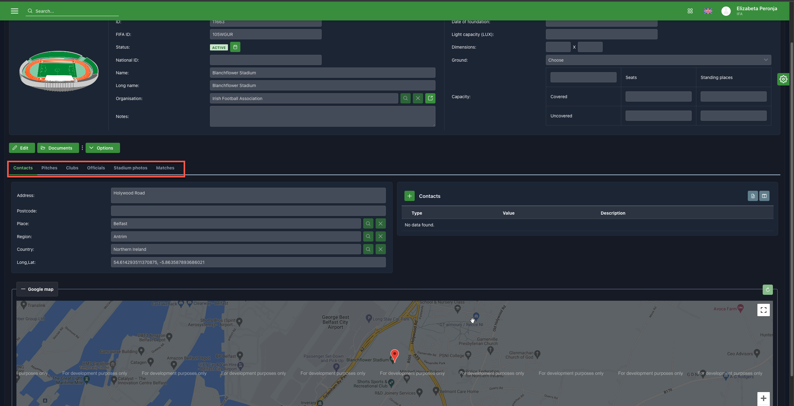 The Stadium form consists of tabs for fast viewing and searching of: