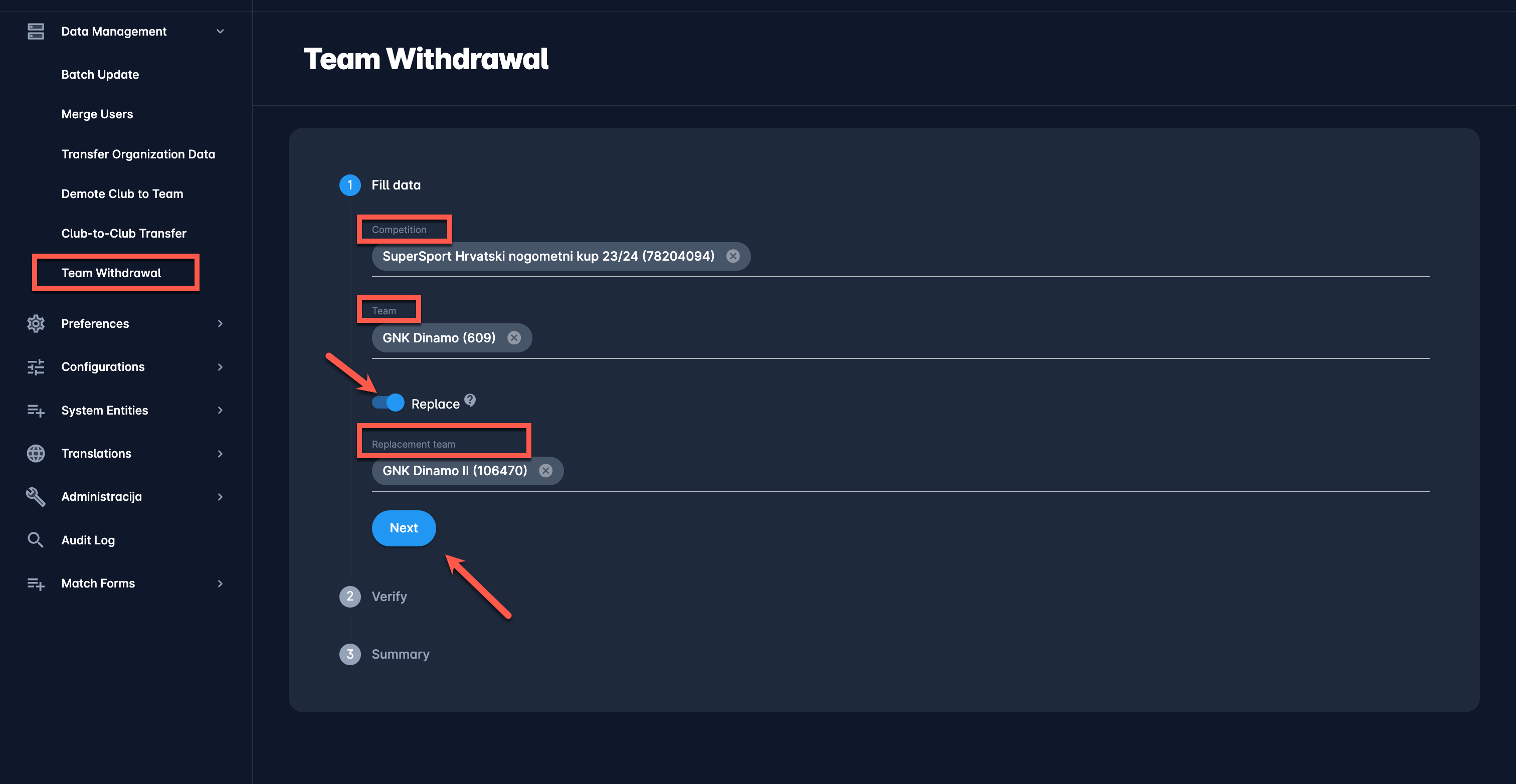 The second step of the wizard is a verification form which contains an information panel describing what will happen in the system upon verifying the replacement of the chosen team in the chosen competition.