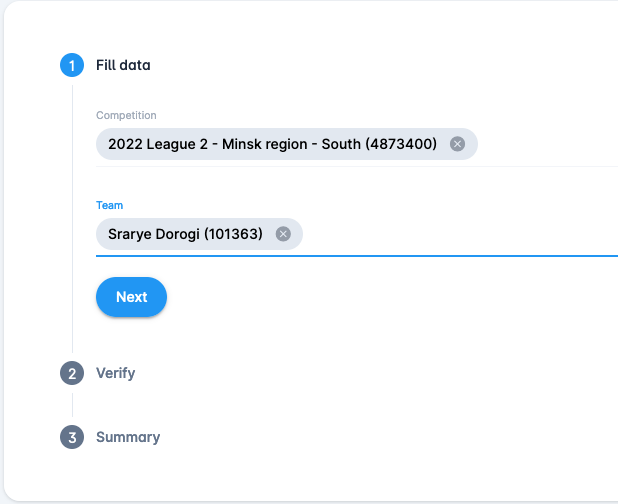 As soon as the competition and team are both selected, button titled “Next” becomes enabled and user may proceed to the second step.