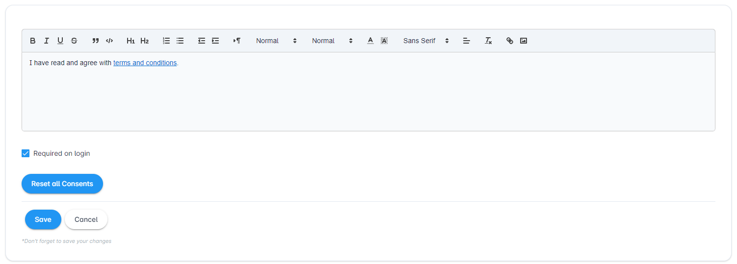 If your Terms and Conditions change, and you wish to repeat each user's acceptance step, you can “Reset all Consents”.