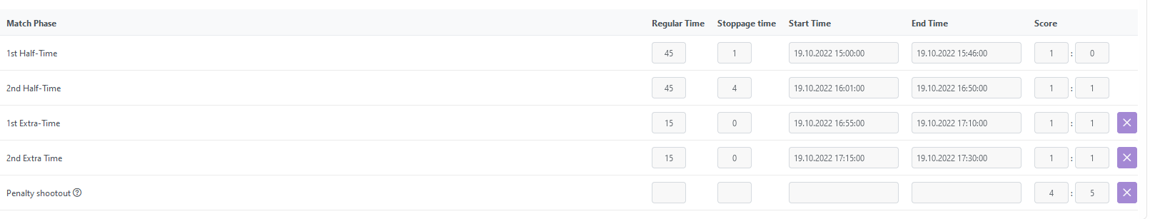 In the list of results per phase, all phases except Penalty Shootout show a cumulative value from the beginning of the match, while the Penalty Shootout phase is treated differently. Penalty Shootout phase results are showing ONLY the goals scored during this final segment of the match.