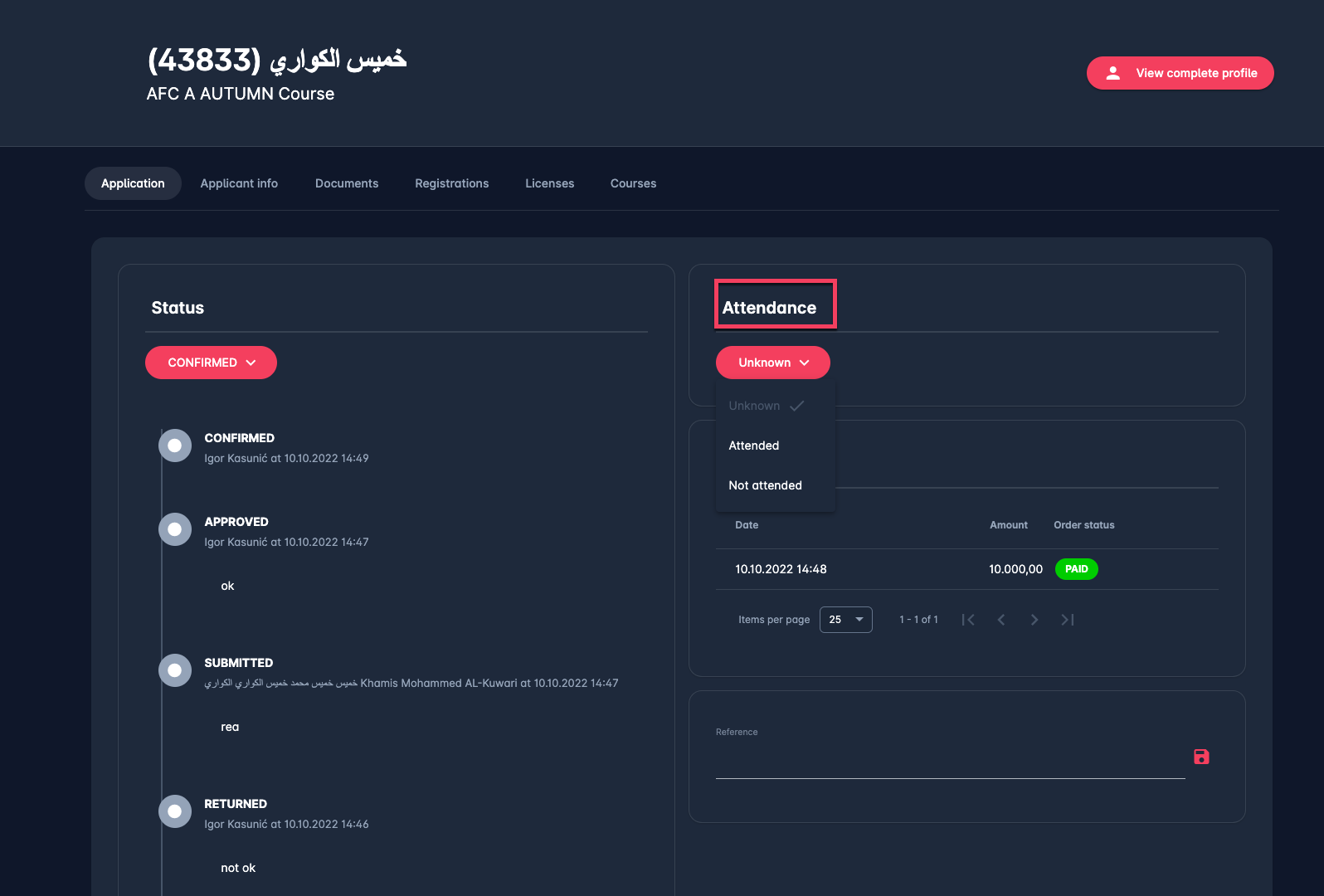 Please consider that the track attendance dropdown is displayed regardless of the participant's status on the seminar (all statuses: SUBMITTED, APPROVED, CONFIRMED, PASSED are shown).