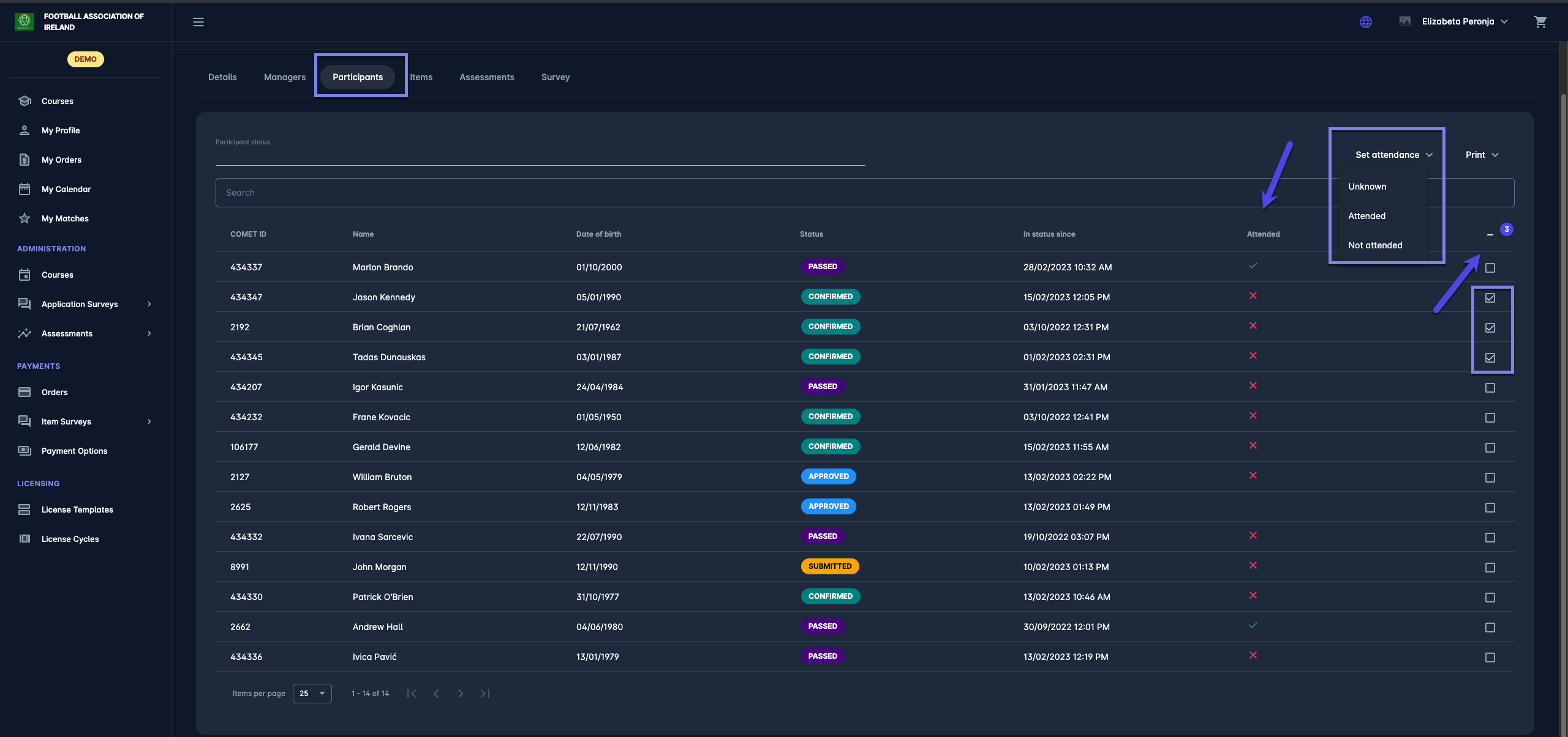 Hit the check box next to the names of participants that you want to change attendance statuses, or choose the Select All check box if applicable