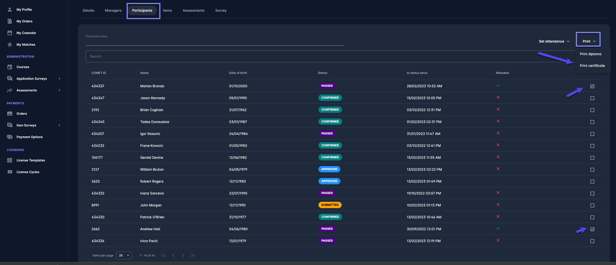 Please consider that certificates are displayed just for participants that have attendance status set to ATTENDED, and that the Print certificate button is only shown if this feature is switched on the Event Menu.