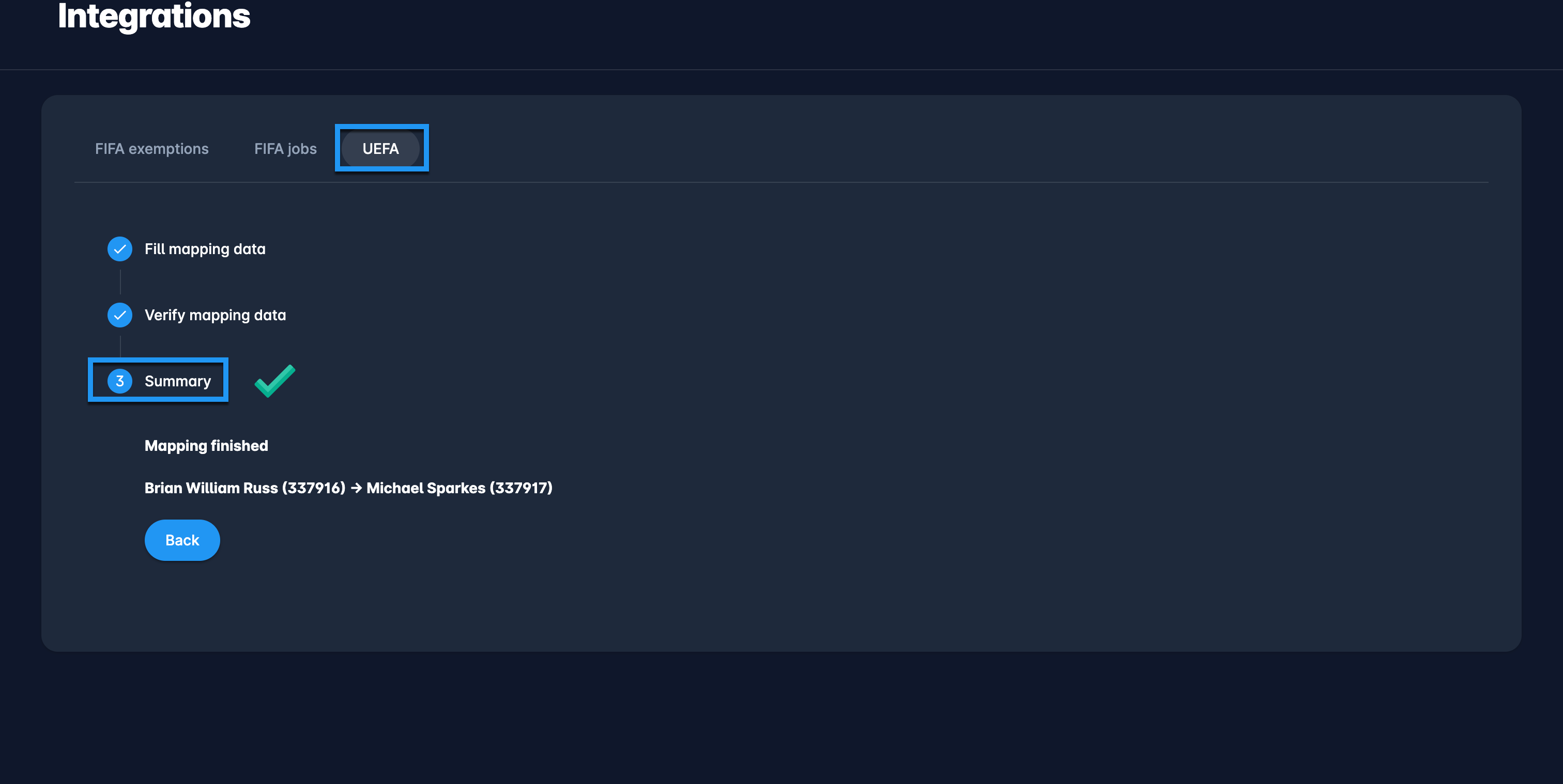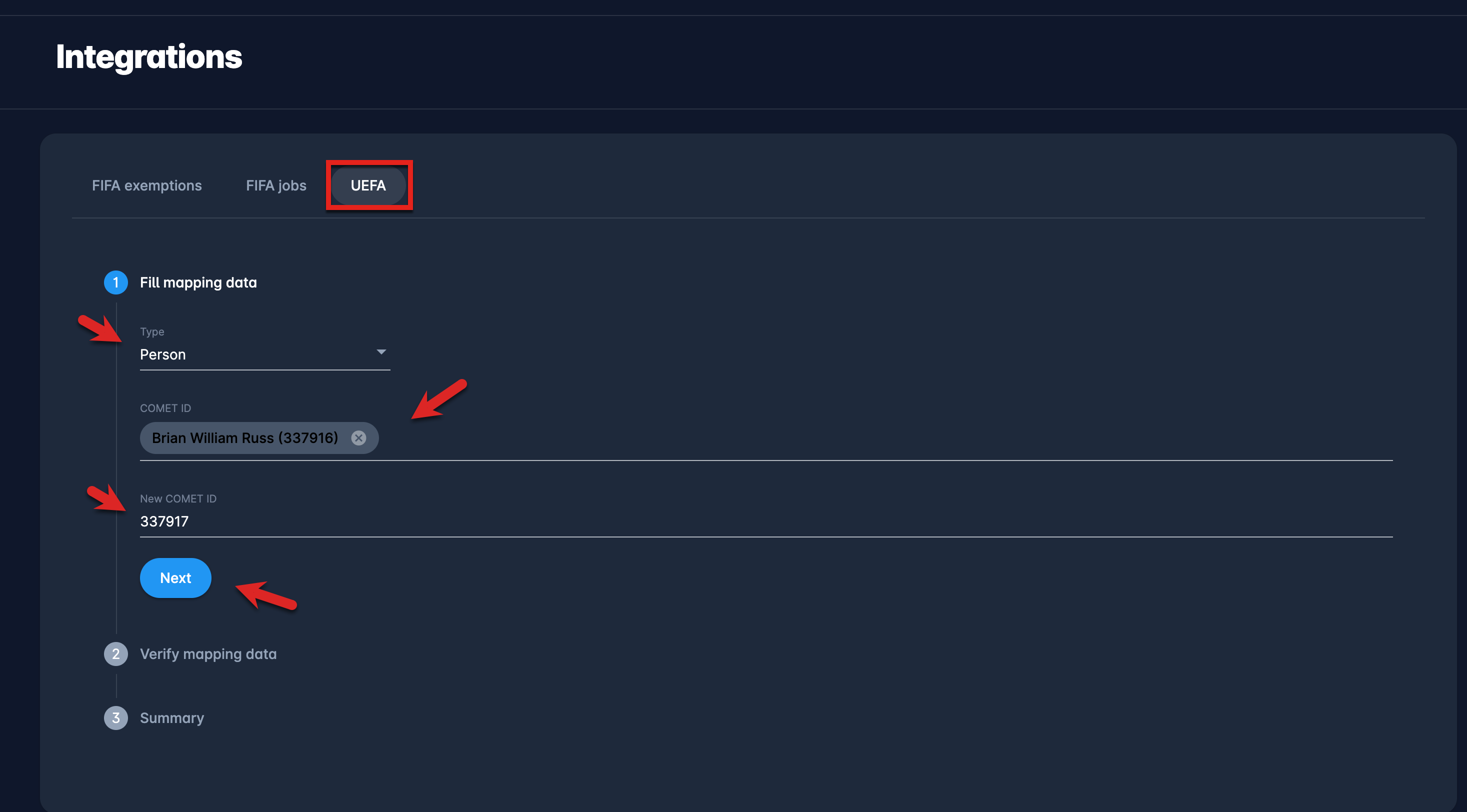 After the import of UEFA Competition, there are cases when UEFA data is mapped to the wrong COMET entity and such mappings often need to be canceled/removed and updated to the correct COMET entity. For that reason, we have developed UEFA Integration functionality for corrections and updates of UEFA Mappings. UEFA Mapping can be conducted for Person, Club, and Facility entities.