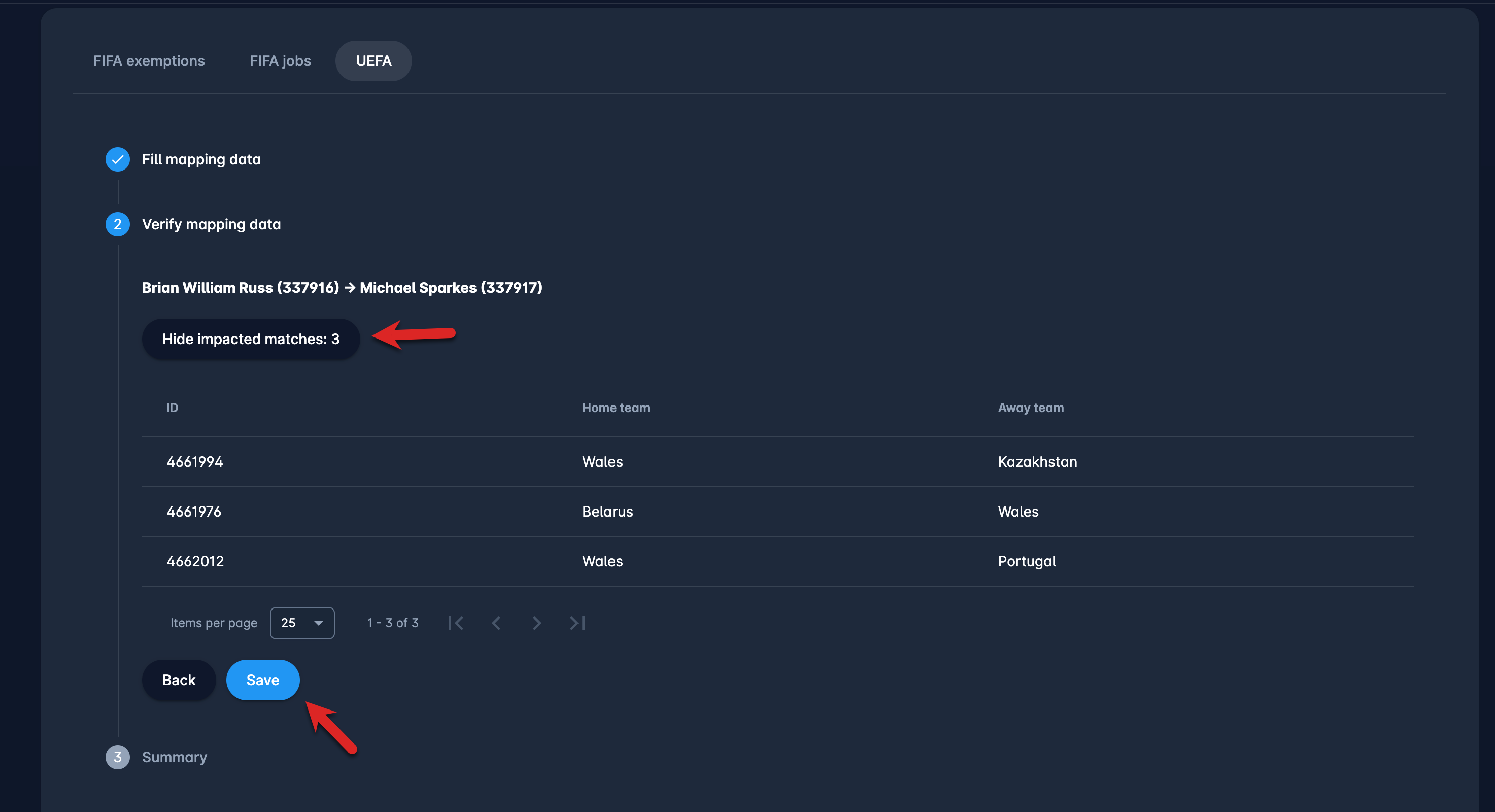 To inspect impacted data; e.g., matches and competitions, hit the View impacted matches/ competitions button