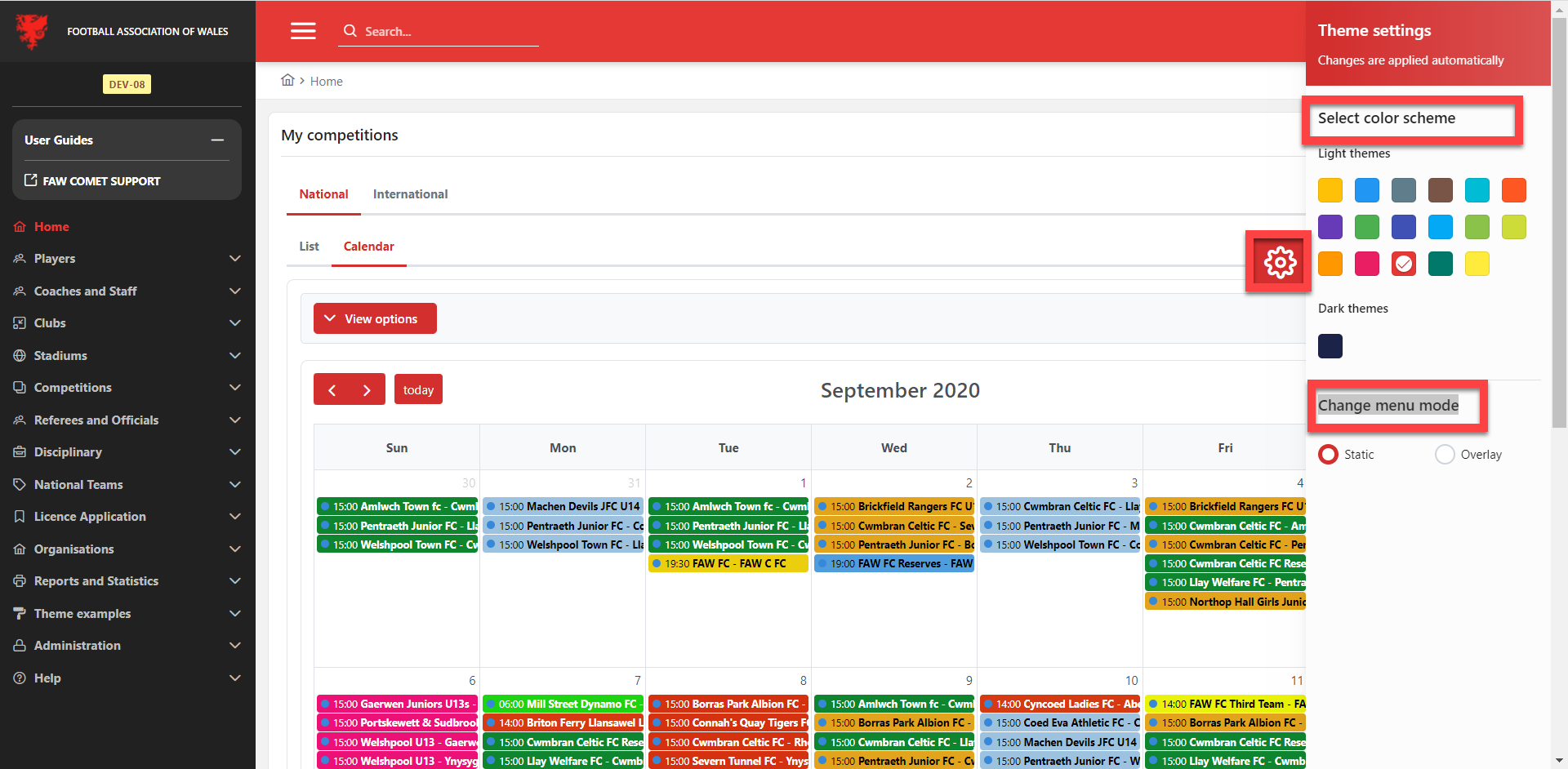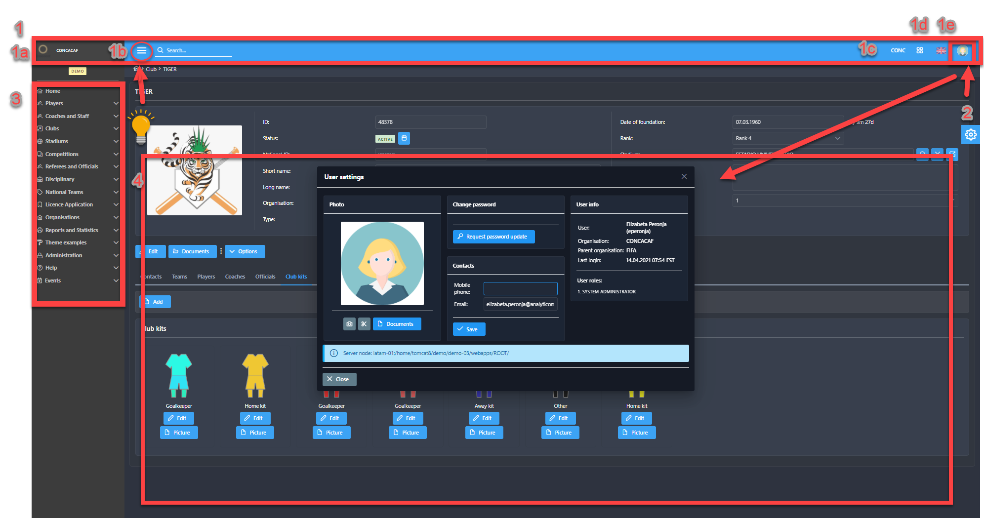 3. Left main menu (primary navigation bar) – all business process functionalities associated with football management are available on the left side menu
