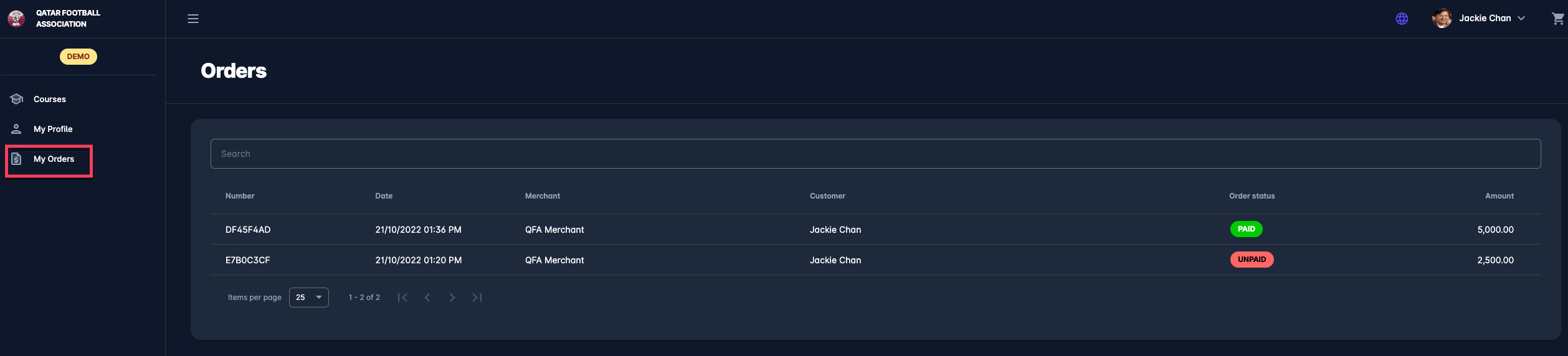 My Orders menu displays the list of all orders, i.e., purchased event items, indicating payment status.