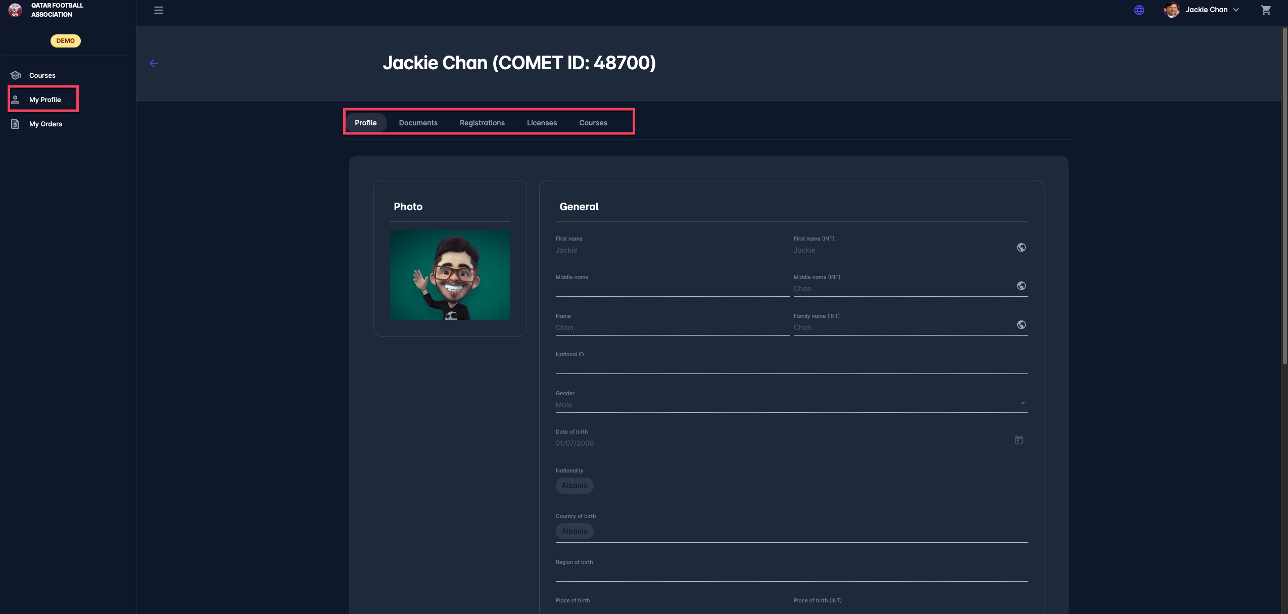 My Profile menu consists of the following profile tabs that contain COMET information relevant to event management: