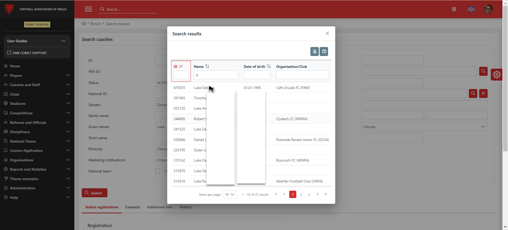 Clicking on a Coach in the list of coaches will get all details about the coach and about his/her registration