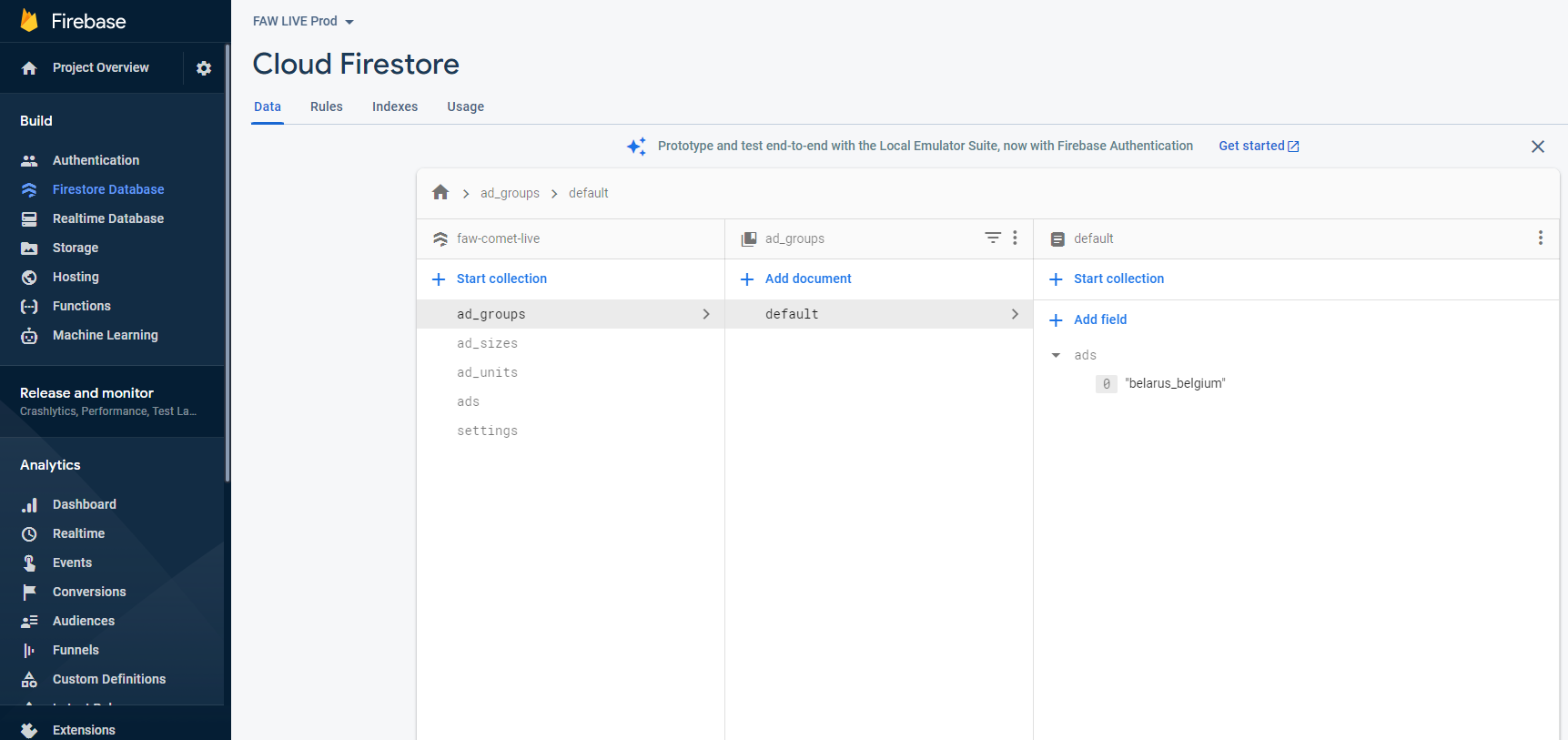 After you have defined ads, you should put them into one ore more ad_groups. Create or edit a document in the collection ad_groups and then add one or more ads into the ad group. In the example below we have only one default ad group, with one ad within that group.