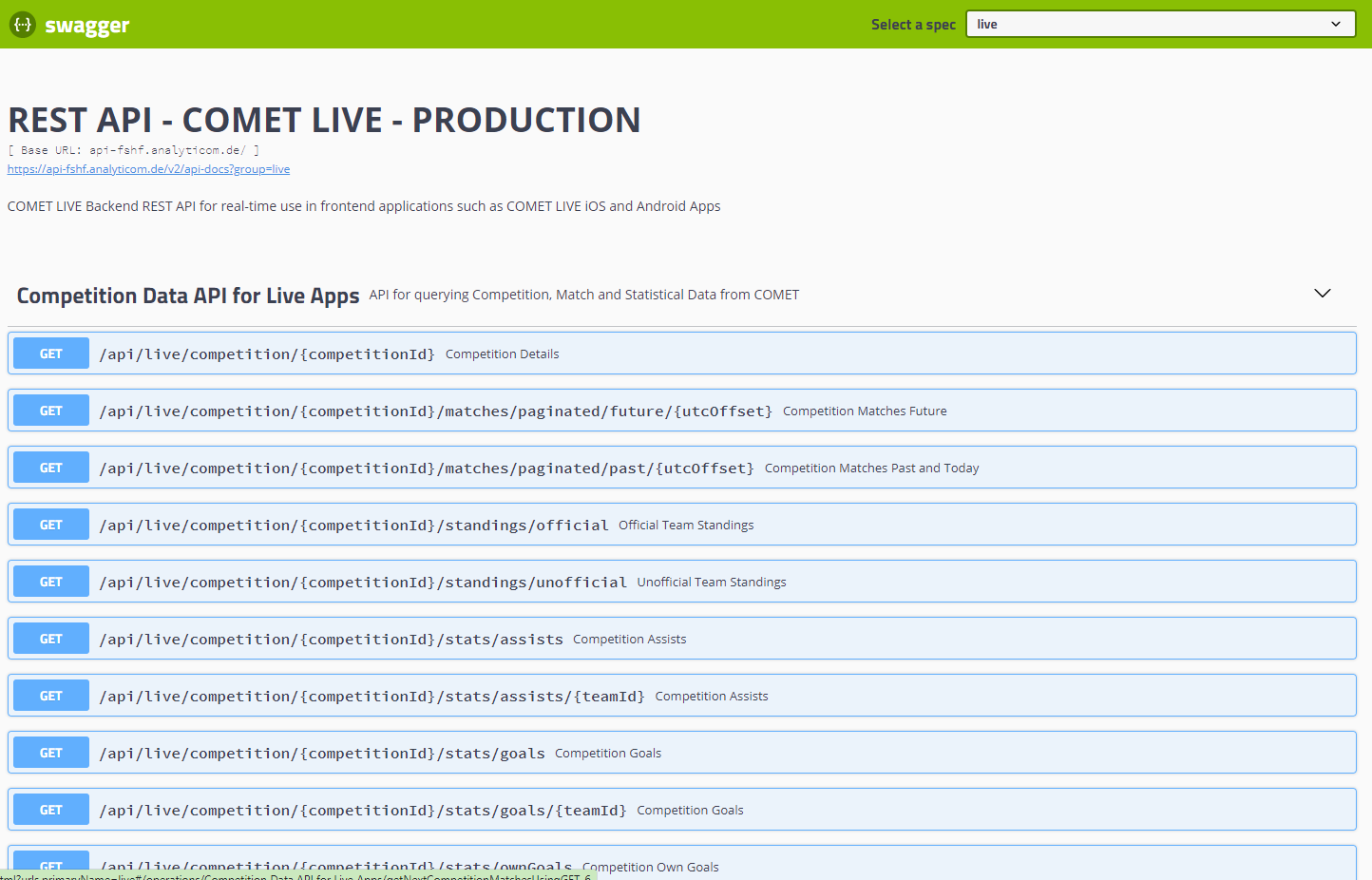 the URL to COMET LIVE API Swagger documentation (incl. the abbreviation of your organization)