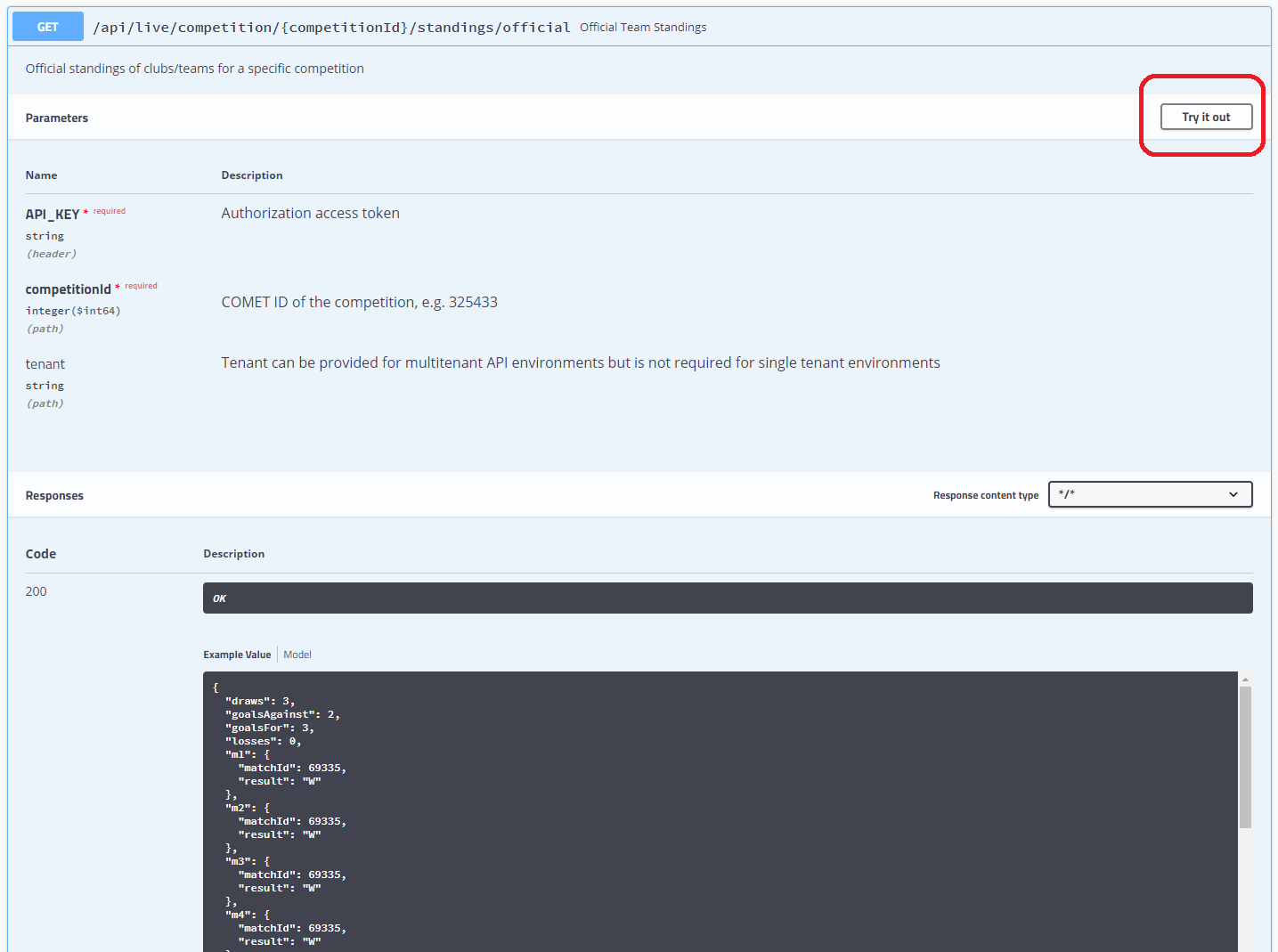 COMET LIVE API endpoints are specified and documented in Swagger, where you can also test the endpoints, by providing an API KEY and input parameters for the specific endpoint.