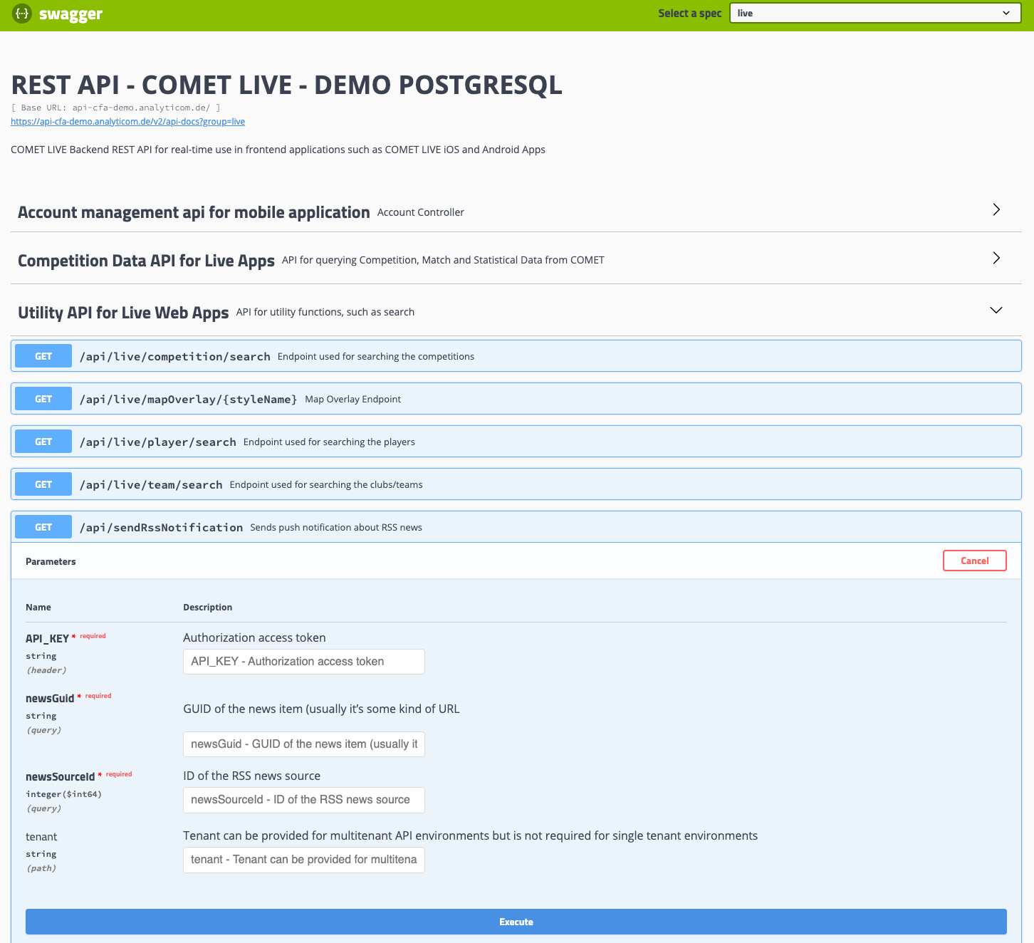 This endpoint can either be called from swagger, or could be implemented as a user-friendly button in your Website News Administration UI (CMS). In all cases, it should be used prudently because each call to triggers triggers a push notification to every user of your COMET LIVE app.