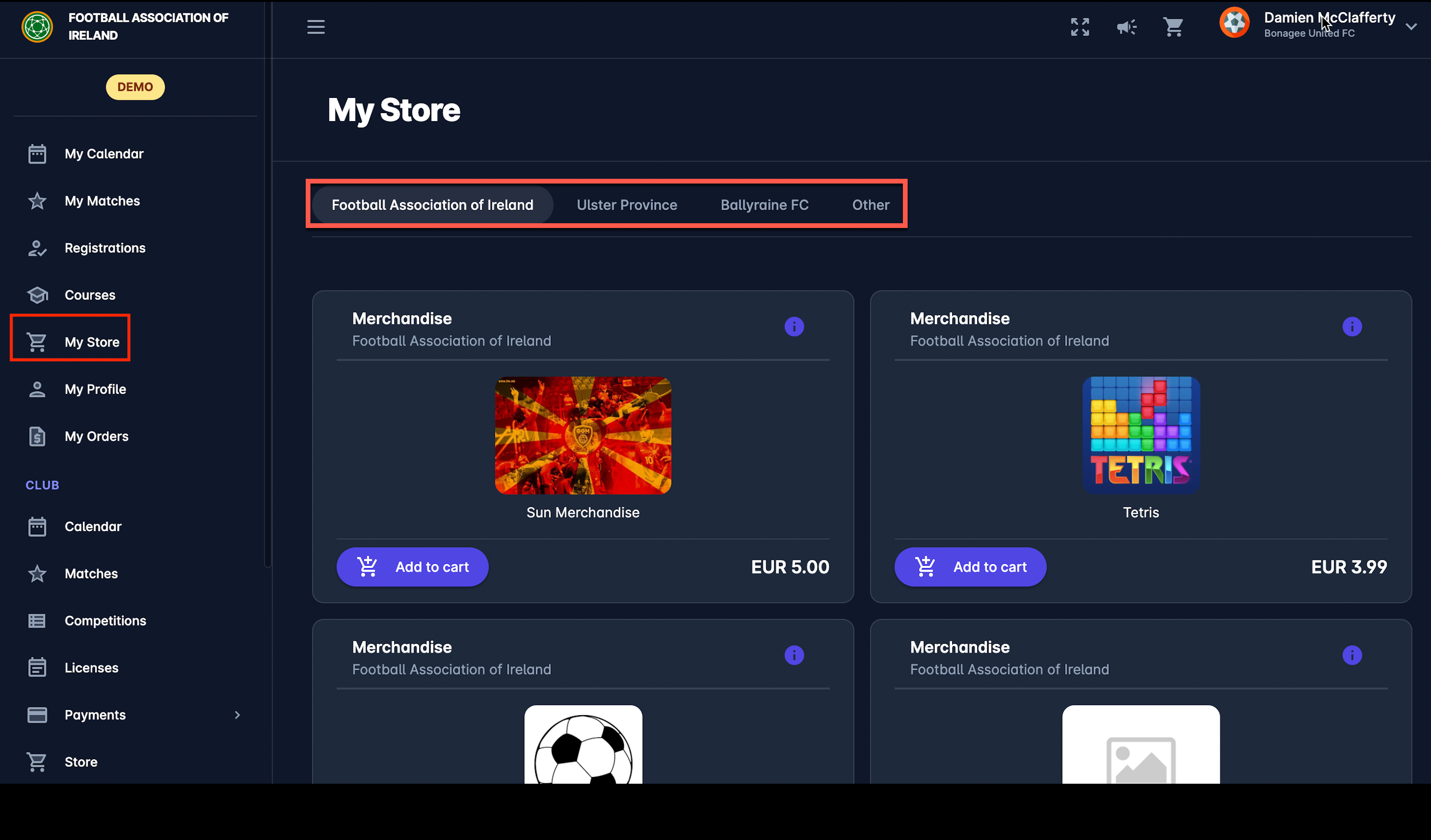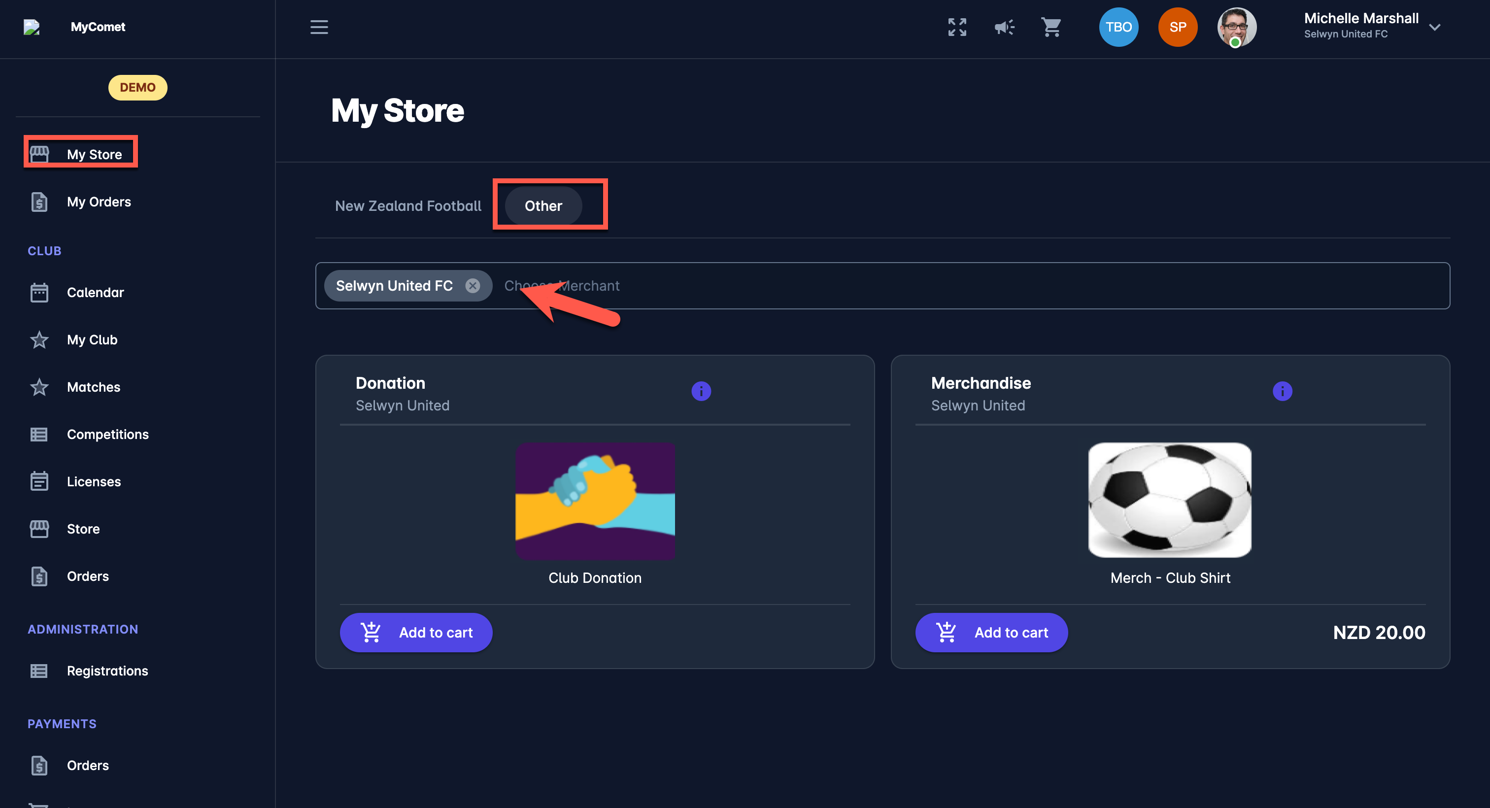 As a COMET user, you can access the General Store (My Store), or as a Club User, you can access the Club Store, and purchase items sold by different organizations (Merchant/ Sellers) such as yearly membership, registration fee, training equipment, club merchandise, donation, etc.
