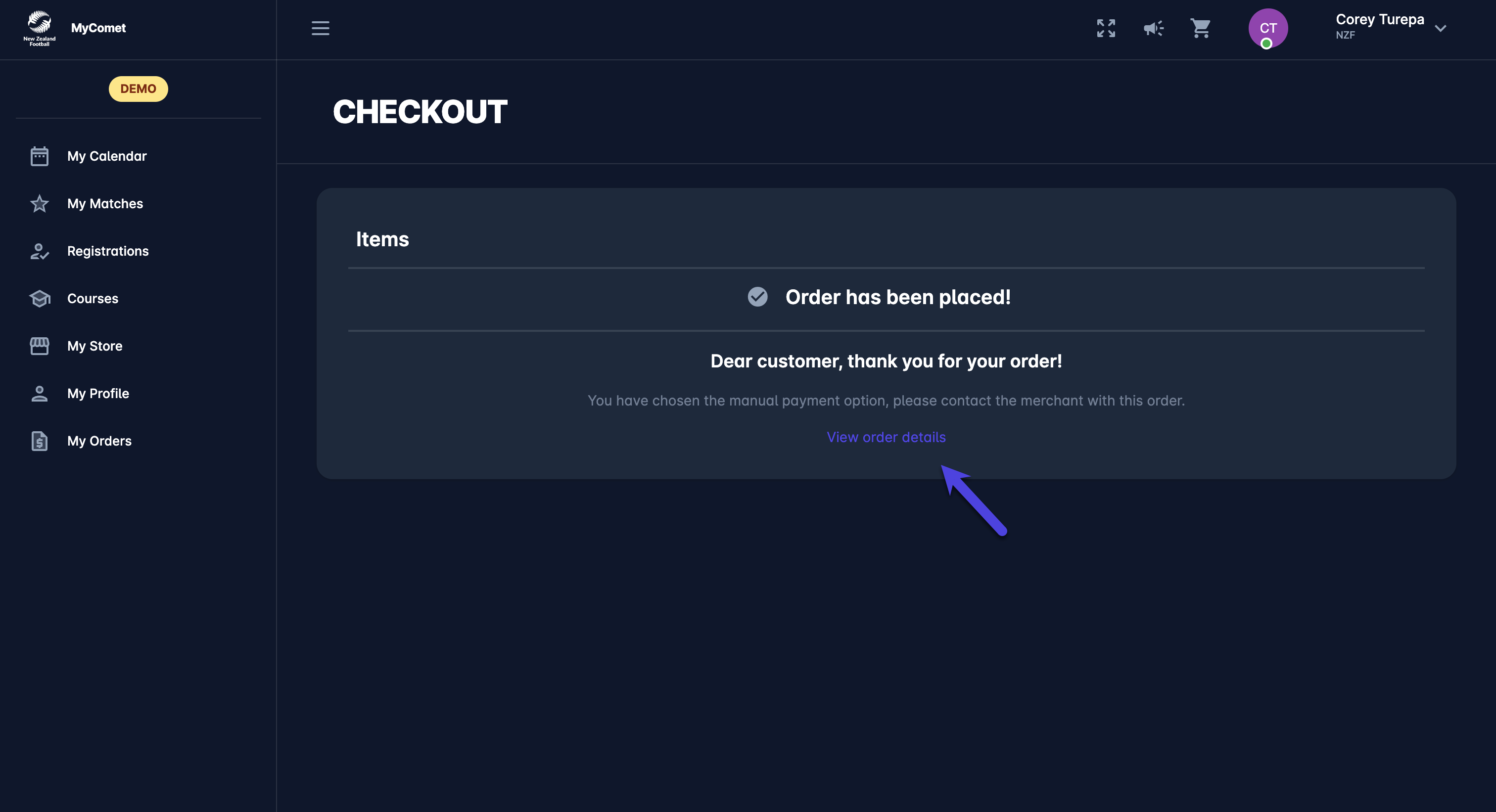 From this page, you can hit the View Orders details button to review to details of the placed order r to proceed with the non-manual payment option (if you have changed your mind).