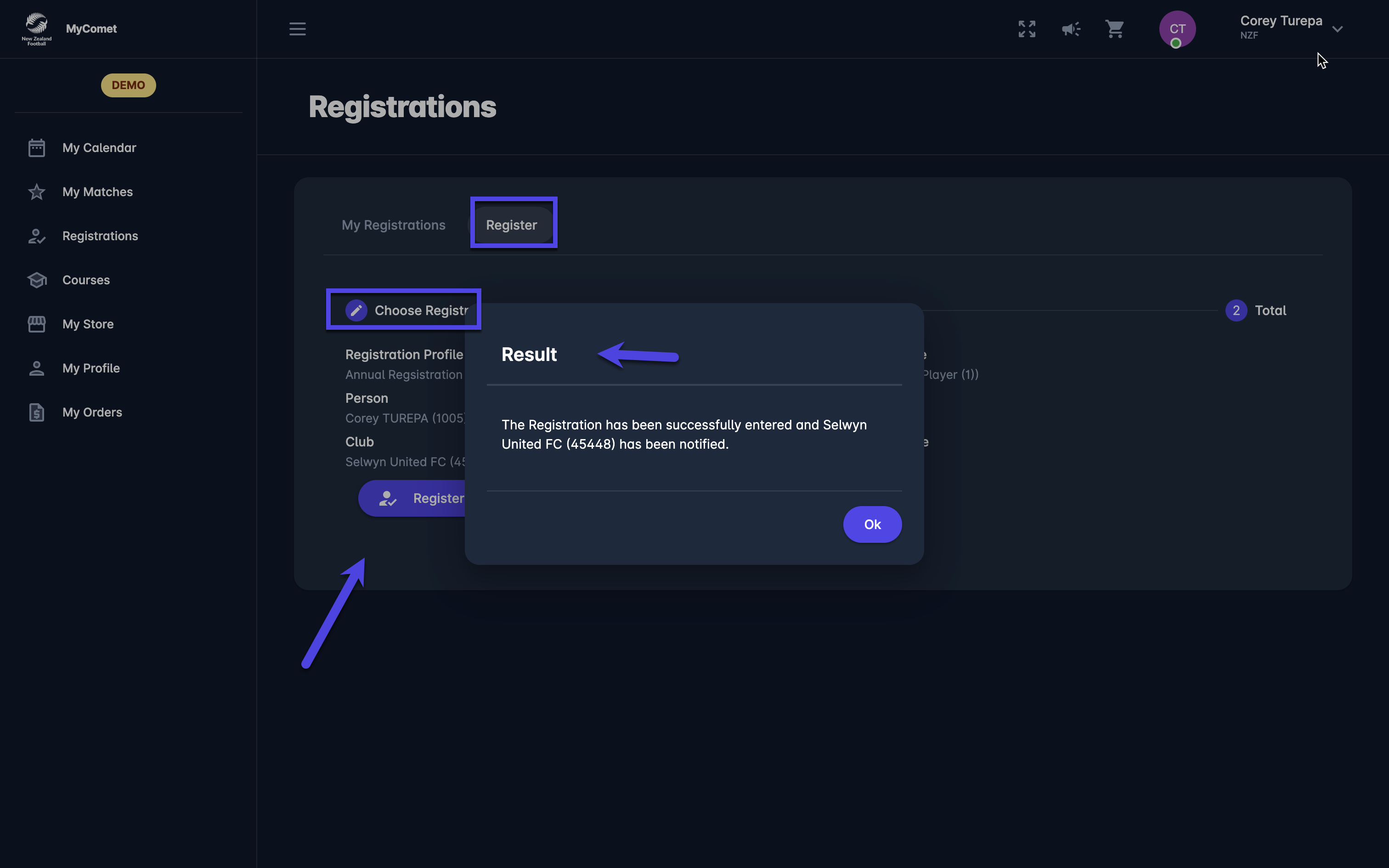 ✅ The registration will be set in status ENTERED and the club will be notified to proceed